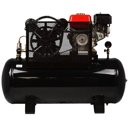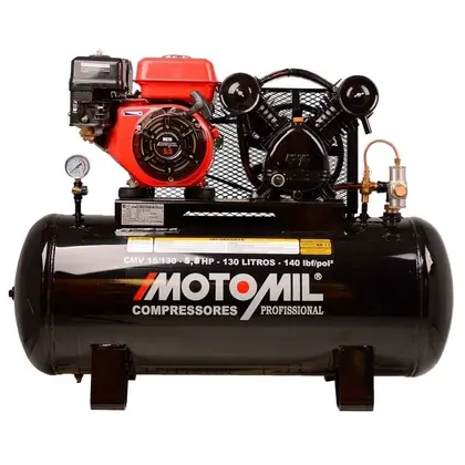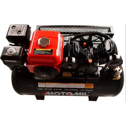 Compressor de ar com motor a gasolina de 5,5 HP. Indicado para atividades em empresas como oficinas mecânicas, postos de serviços, marcenarias, serralherias e também em sítios, fazendas, entre outros.