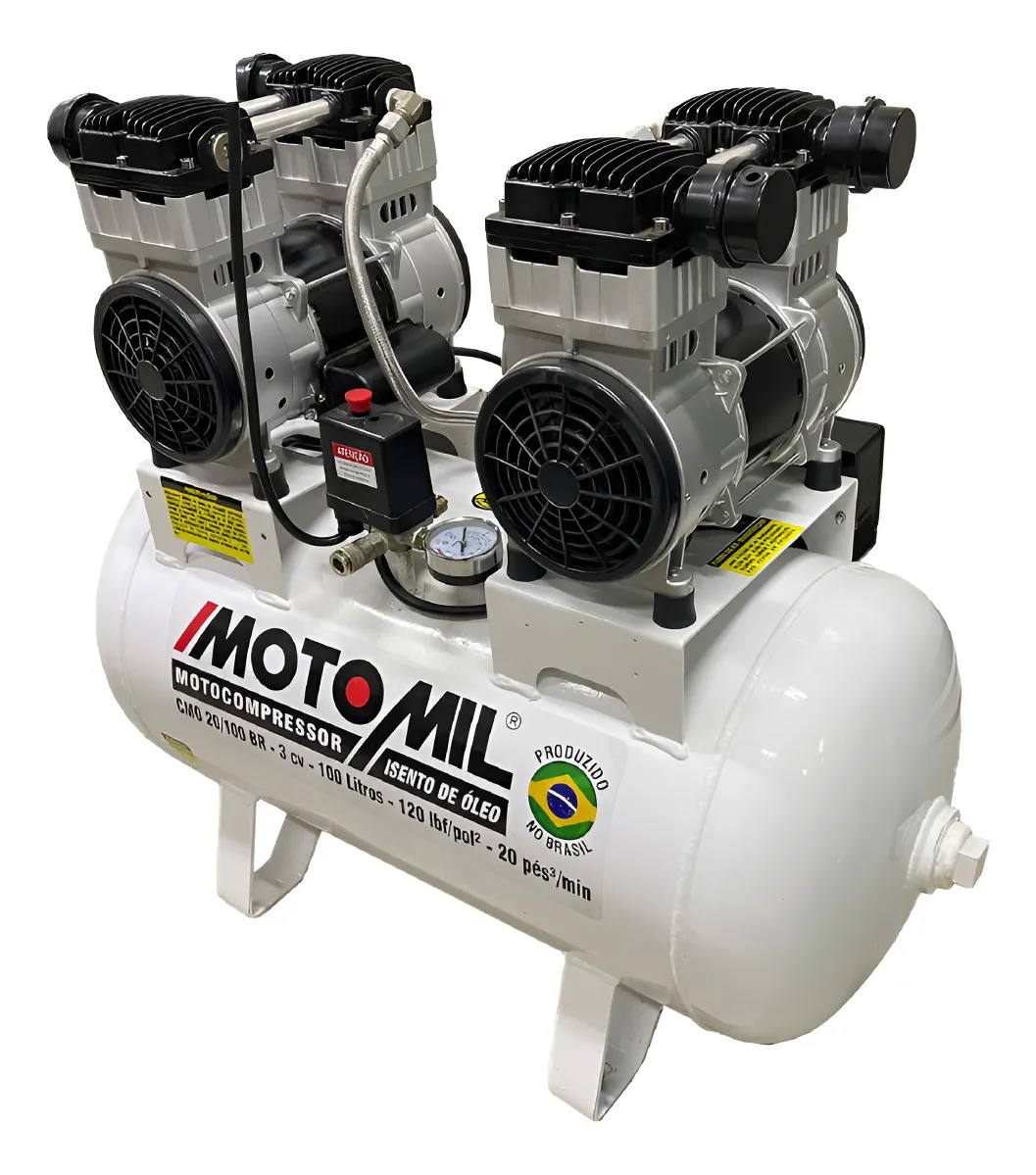 Compressor De Ar Odontológico 20 Pés 100l Silencioso Sem óleo 4CV CMO-20/100BR Compressor desenvolvido especialmente para consultórios odontológicos, oferecendo ar limpo e livre de óleo, com baixo nível de ruído e excelente desempenho. Equipado com reservatório de 100 litros, rodas e alças dianteira e traseira para facilitar o transporte e a mobilidade no ambiente clínico *Isento de óleo, garantindo ar puro e ideal para aplicações odontológicas *Baixo nível de ruído, adequado para ambientes clínicos *Reservatório com 100 litros de capacidade *Estrutura com rodas e alças para fácil movimentação Ideal para consultórios odontológicos, tem baixo nível de ruído, isento de óleo, reservatório com rodas e alças dianteira e traseira, proporcionando eficiência e qualidade do ar. Especificações Técnicas: – Dados Técnicos: *Código: 46691.0 *Tensão: 220V *Número de fases: Monofásico *Frequência: 60 Hz *Potência do motor: 2x(2,0/1,5) HP *Deslocamento Teórico: 20 pés³/min. 587 l/min. *Número de estágios: 1 estagio *Número de pistão: 2 *Volume do reservatório: 100 litros *Pressão de operação (Mínimo): 80 lbf/pol² – 5,5 bar *Pressão de operação (Máximo): 120 lbf/pol² – 8,3 bar *Rotação da unidade compressora: 1750 rpm *Volume de óleo: Isento (compressor sem óleo) Produto indicado para quem busca desempenho, confiabilidade e qualidade do ar em aplicações odontológicas.