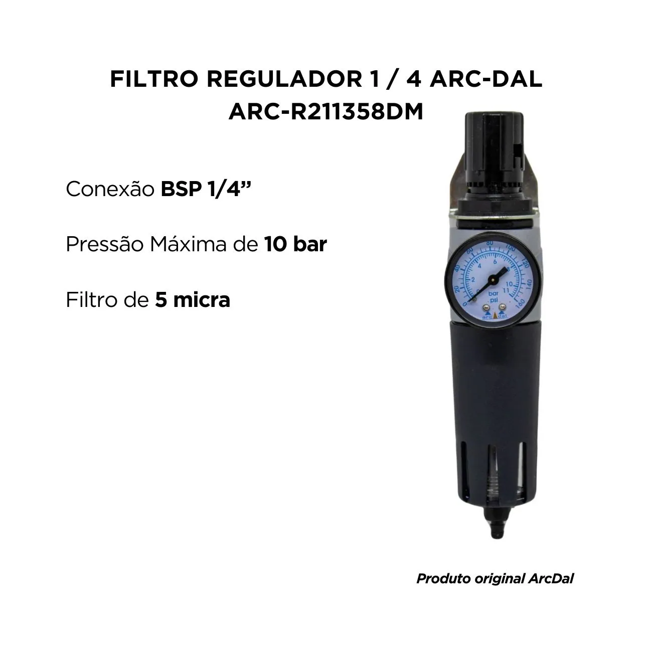 FILTRO REGULADOR 1 / 4 ARC-DAL ARC-R211358DM :: Conexão BSP 1/4” :: Pressão Máxima de 10 bar :: Filtro de 5 micra. :: Reservatório Transparente. :: Dreno Manual. :: Produto original Arc Dal Usado para: regula a pressão e remove impurezas como partículas sólidas e umidade Cuidado com o produto: :: Realize drenagem periódica do reservatório para evitar acúmulo de água. :: Não ultrapasse a pressão máxima recomendada de 10 bar. :: Verifique e substitua o filtro regularmente para manter a eficiência do sistema. :: Garanta uma instalação correta, respeitando a direção do fluxo de ar indicada no corpo do filtro