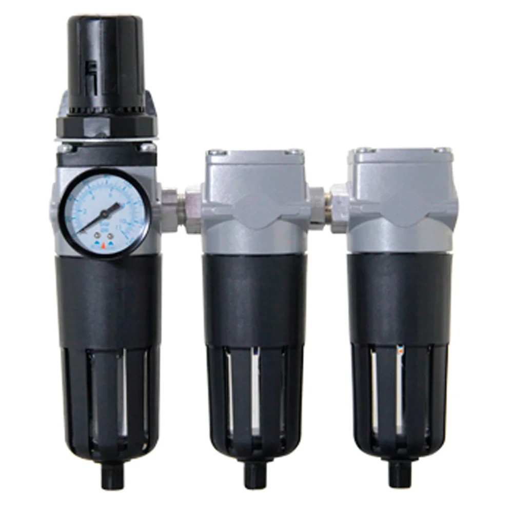 Conjunto odontológico com filtro regulador + filtro coalescente + carvão é indicado para uso odontológico, onde se necessita de um tratamento mais cuidadoso do que o ar comprimido para uso industrial. Os sistemas de filtragem convencionais não eliminam partículas sólidas de aerossóis, água e óleos contaminantes. Desta forma, o filtro regulador de pressão tem a função de filtrar o ar comprimido e regular a pressão de trabalho; o filtro de ar coalescente tem a função de reter aerossóis, óleo, água e partículas submicronicas sólidas e o filtro de ar carvão ativado tem a função de reter gidrocarbonetos responsáveis pelo odor, vapores, colóides e substâncias químicas orgânicas.