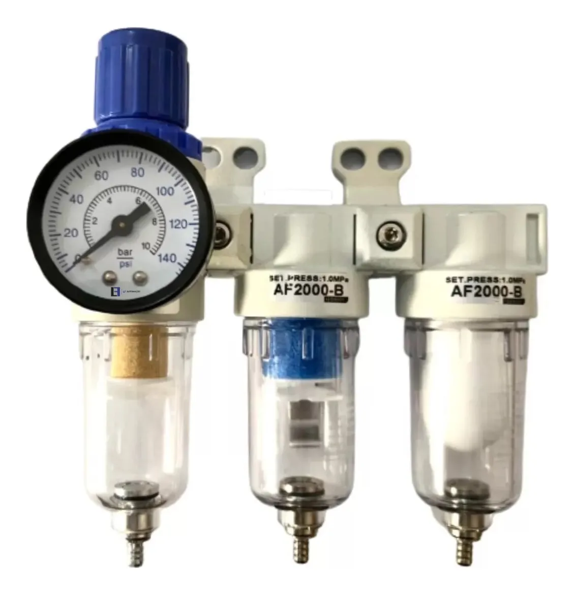 Filtro de Ar Odontológico Trio Rosca 1/4 com Manômetro A estrutura se baseia em Filtro de ar com regulador de pressão e manômetro + Filtro de ar com elemento coalescente + Filtro de ar com carvão ativado.