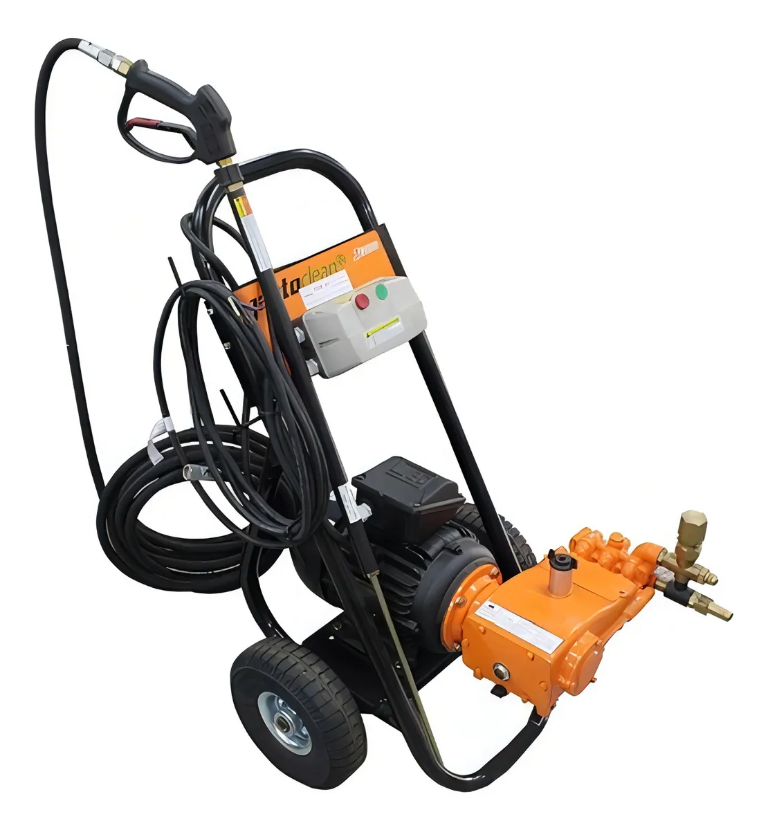 Com estrutura robusta e resistente, a Jacto J12000 conta com um cabeçote de latão forjado, pistões de cerâmica, válvula de inox e regulador de graxetas. De fácil locomoção e longo alcance, ela conta com pneus de borracha maciça e cabo elétrico de 5 metros, além de carrinho reforçado com estrutura de aço.