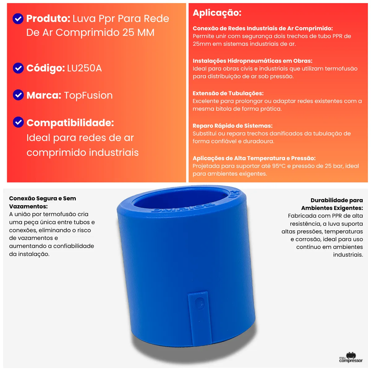 A Luva PPR TOPFUSION é uma conexão de alta qualidade projetada para unir tubos de 25 mm (3/4″) em sistemas de ar comprimido, garantindo instalação segura, eficiente e durável.
