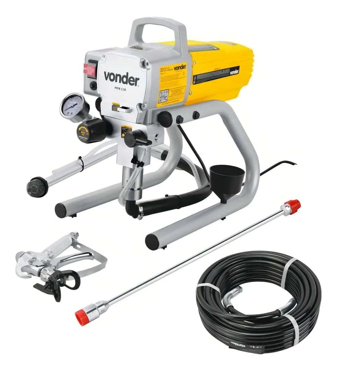 Especificações Técnicas – Marca: Vonder – Potência do motor: 1,2 hp / 900 W – Pressão máxima de saída: 3.000 lbf / pol² (PSI) – Vazão da pistola para pintura: 2,2 Litros/min – Bico padrão: 517 – Leque: abertura de 25 cm a 30 cm / espessura: 0,43 mm (0,017″) – Rosca da conexão da mangueira: 1/4″ NPSM – Comprimento do cordão elétrico: 2,50 m – Comprimento do tubo extensor:457 mm – Material do tubo extensor: Alumínio – Peso: 15,5 kg – Tensão: 220 V – Frequência: 50 Hz / 60 Hz Conteúdo da Embalagem – 01 Mangueira com 15 m – 01 Pistola de pintura bico 517 – 01 Tubo extensor para pintura
