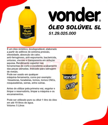 Óleo solúvel, 5 litros, VONDER É um óleo biodegradável, elaborado a partir de aditivos de extrema pressão, oleosidade, absorção de calor, anti-ferruginoso, anti-espumante, bactericida, untuoso, viscoso e transparente em solução aquosa. Rendimento superior nas ferramentas de corte e excelente acabamento das peças usinadas. Óleo refrigerante para máquinas operatrizes, tornos, serras, fresas e retífica. Especificações: Conteúdo da embalagem (ml ou L): 5 L Diluição: 1 Litro do óleo em até 19 litros de água Aspecto/aparência: Líquido transparente Odor: Leve Inflamável (sim/não): Não Conteúdo da Embalagem: 1 Galão com 5 litros de óleo solúvel.