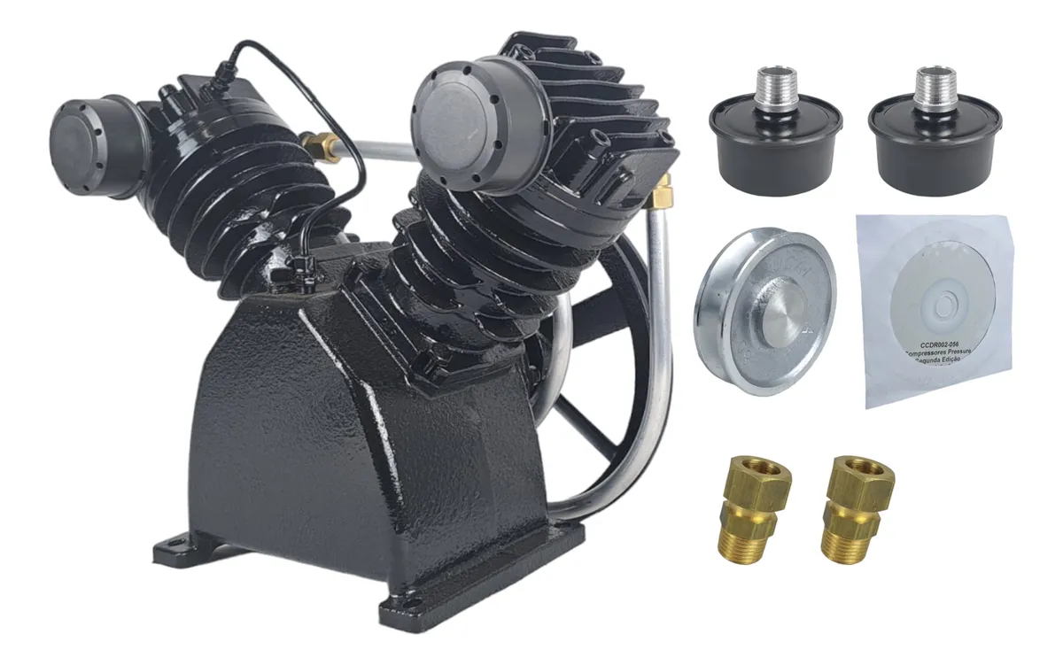 DESCRIÇÃO: – Deslocamento Teórico: 425 l/min – 15 pcm – Cilindrada do Cabeçote: 310 cm³ – Pressão máxima: 140 psi – 9,6 bar – Canal do Volante e Polia : Perfil A – Peso do Cabeçote: 24,0 kg – Diametro Volante: 300 mm – Modelo : FF 15 VP – RPM do Bloco: 1167 – Nº de Cilindros: 3 – Nº de Estágios: 1